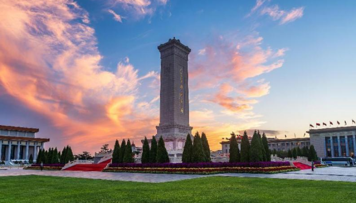 天安門廣場,晚霞映襯下的人民英雄紀(jì)念碑