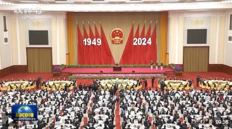 人民大會(huì)堂宴會(huì)廳華燈璀璨,洋溢著喜慶熱烈的節(jié)日氛圍。主席臺(tái)上方高懸著莊嚴(yán)的國徽,“1949-2024”大字年號(hào)在鮮艷紅旗映襯下格外醒目。