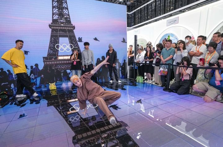 2024年9月14日,在2024年服貿(mào)會國家會議中心綜合展區(qū)的主賓國法國展臺,中法兩國街舞好手在表演霹靂舞。