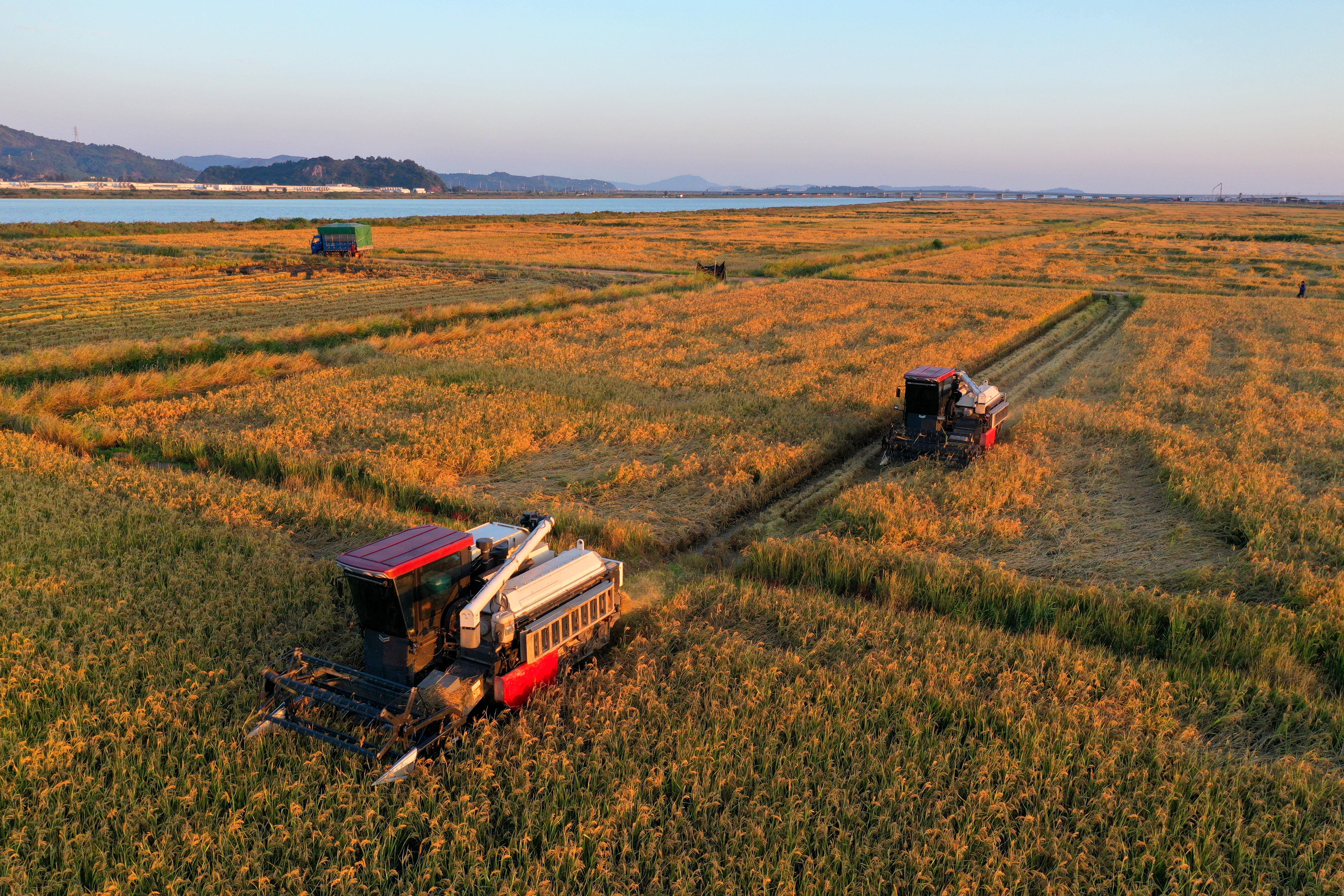 深秋時節(jié),浙江省玉環(huán)市漩門三期智慧農(nóng)業(yè)示范基地的海水稻迎來豐收,農(nóng)民駕駛收割機忙著收割。
