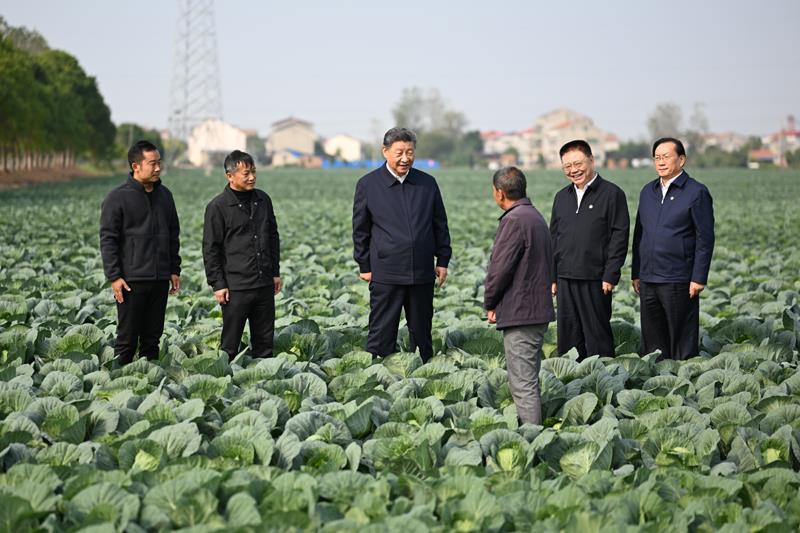 2024年11月5日,習近平總書記在湖北省咸寧市嘉魚縣潘家灣鎮(zhèn)十里蔬菜長廊考察時,同菜農(nóng)親切交流。