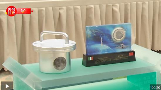 工藝擺件以嫦娥五號(hào)探月為設(shè)計(jì)元素,月球部分裝有月壤。科研樣品為月壤鏟取樣和鉆取樣,展現(xiàn)了中意航天領(lǐng)域合作高水平。