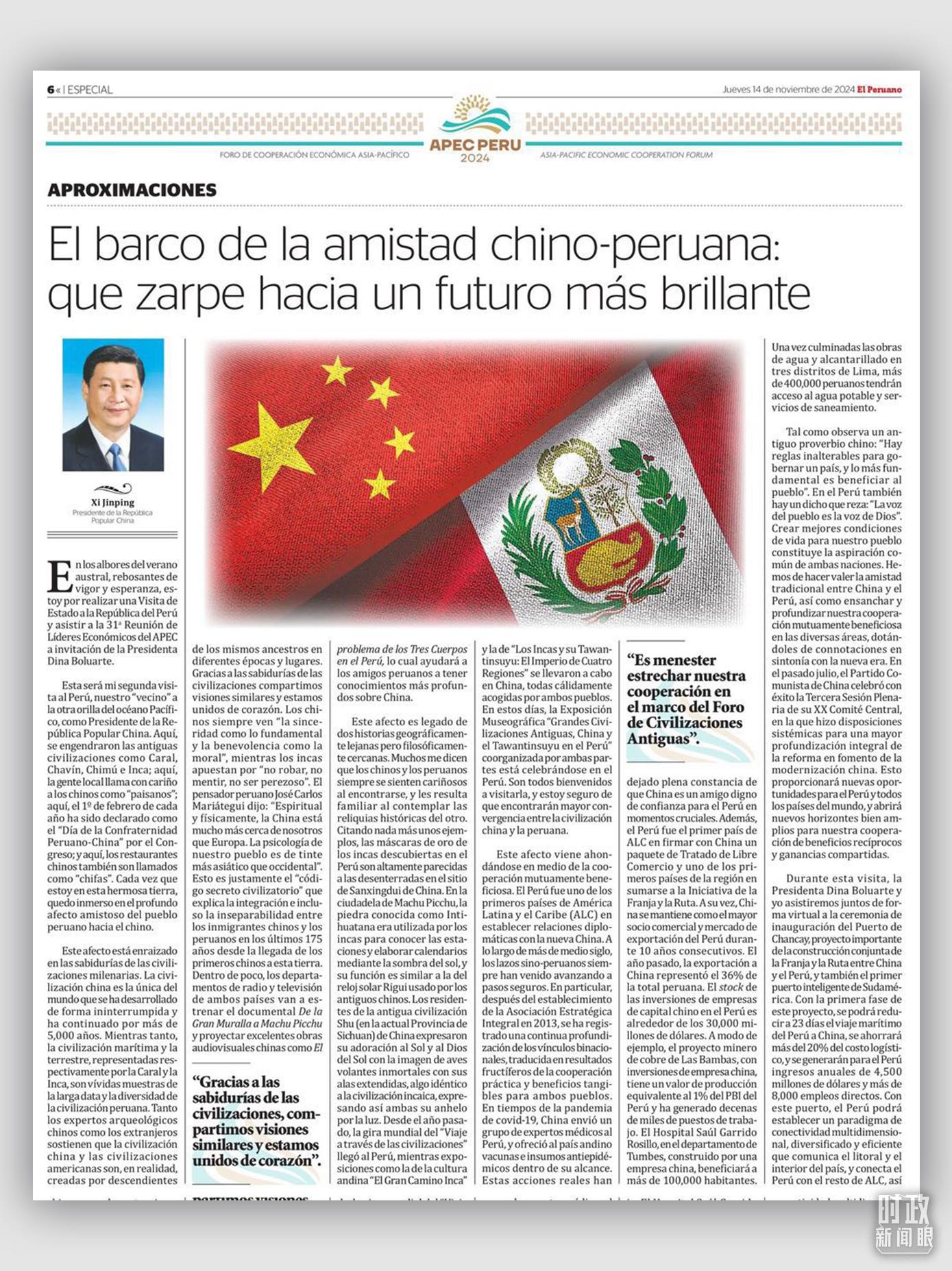 “我謹(jǐn)向您發(fā)出最熱情的邀請,希望您撥冗出席2024年亞太經(jīng)合組織(APEC)領(lǐng)導(dǎo)人非正式會(huì)議,并對(duì)秘魯再次進(jìn)行國事訪問?!比ツ?1月,秘魯總統(tǒng)博魯阿爾特在舊金山向習(xí)主席發(fā)出誠摯邀請。