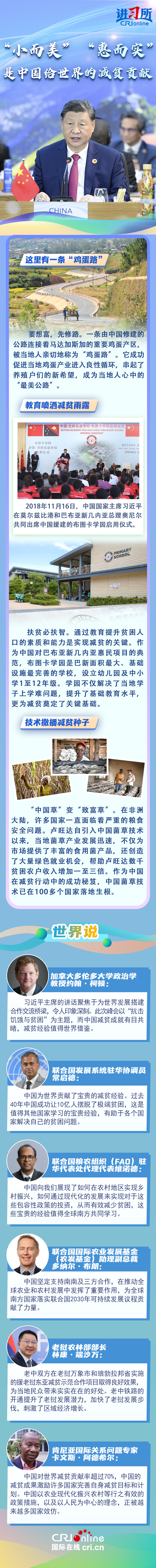 “世界繁榮穩(wěn)定不可能建立在貧者愈貧、富者愈富的基礎(chǔ)之上。”近年來,中國一直在用實際行動與世界分享脫貧經(jīng)驗:與東盟國家共同開展鄉(xiāng)村減貧推進計劃,在非洲開展基礎(chǔ)設(shè)施建設(shè)和農(nóng)業(yè)、醫(yī)療等技術(shù)合作援助項目,在拉美援建農(nóng)業(yè)技術(shù)中心......一批批“小而美”“惠而實”的民生項目落地生根,幫助當?shù)孛癖姅[脫貧困。多國人士表示,中國成功打贏脫貧攻堅戰(zhàn)具有世界意義,不僅為發(fā)展中國家提供了借鑒經(jīng)驗,更有助于推動建設(shè)一個共同發(fā)展的公正世界。