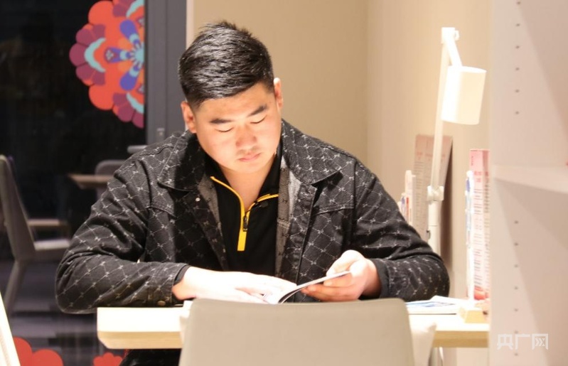 吳濤在共享圖書館看書(央廣網(wǎng)記者 唐奇云 攝)