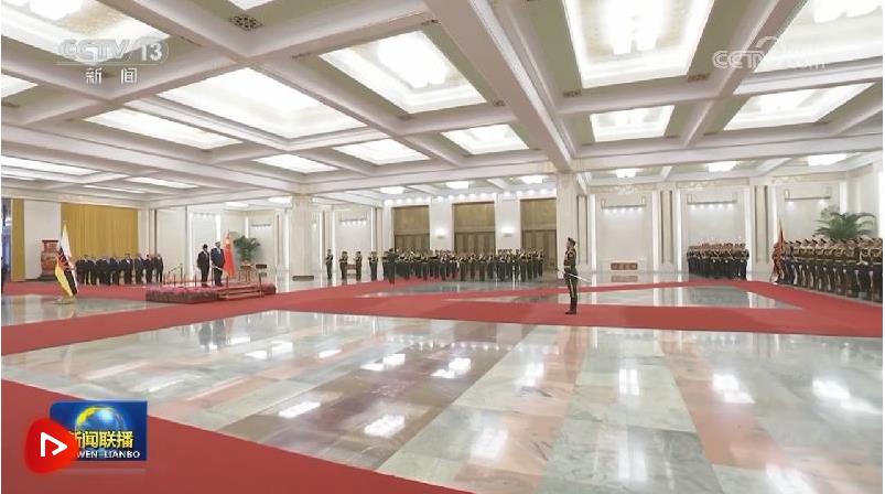 2月6日上午,國家主席習近平在北京人民大會堂同來華進行國事訪問的文萊蘇丹哈桑納爾舉行會談。這是會談前,習近平在人民大會堂北大廳為哈桑納爾舉行歡迎儀式。