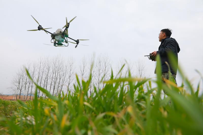 2025年2月14日,在浙江杭州市臨安區(qū)天目山鎮(zhèn)“天目糧倉”糧食功能區(qū),農(nóng)機(jī)人員遙控植保無人機(jī)給小麥?zhǔn)┓省?/p>