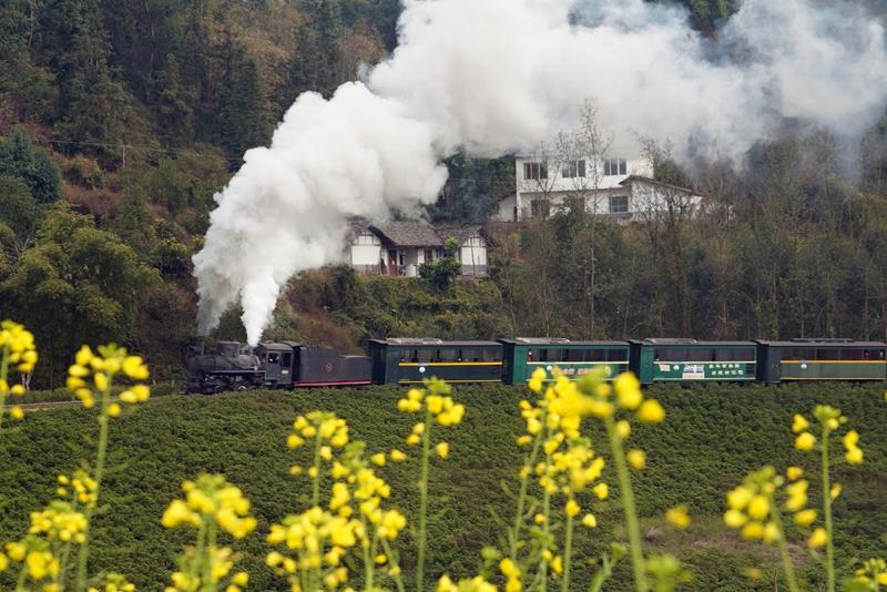 2025年2月14日,四川樂山市犍為縣菜子壩景點(diǎn)試種的早季油菜花進(jìn)入盛開期,蒸汽小火車穿越油菜花海,吸引不少游客前來觀看。