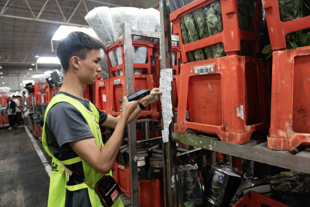 2023年7月13日,一名工作人員在昆明國(guó)際花卉拍賣(mài)交易中心內(nèi)對(duì)臺(tái)車(chē)上存放的鮮花掃碼。