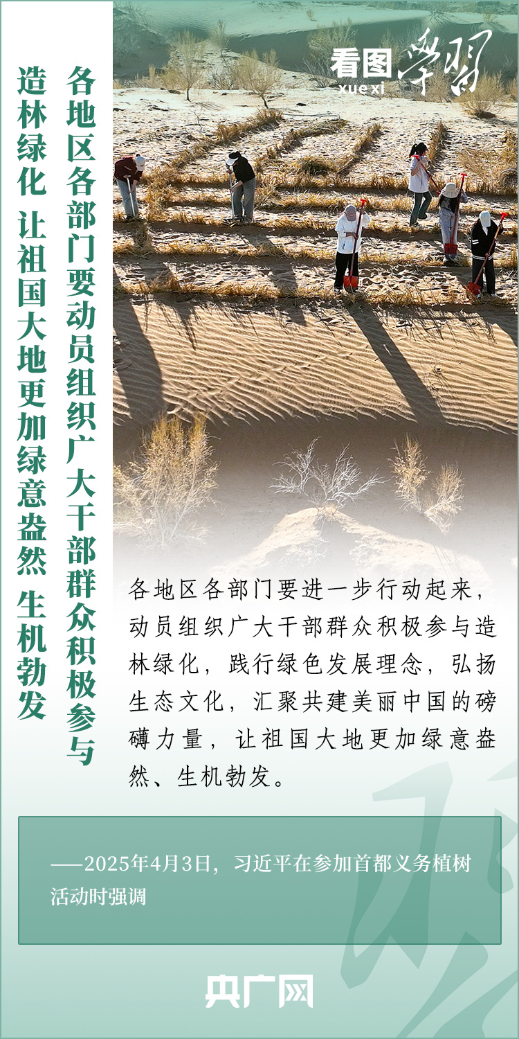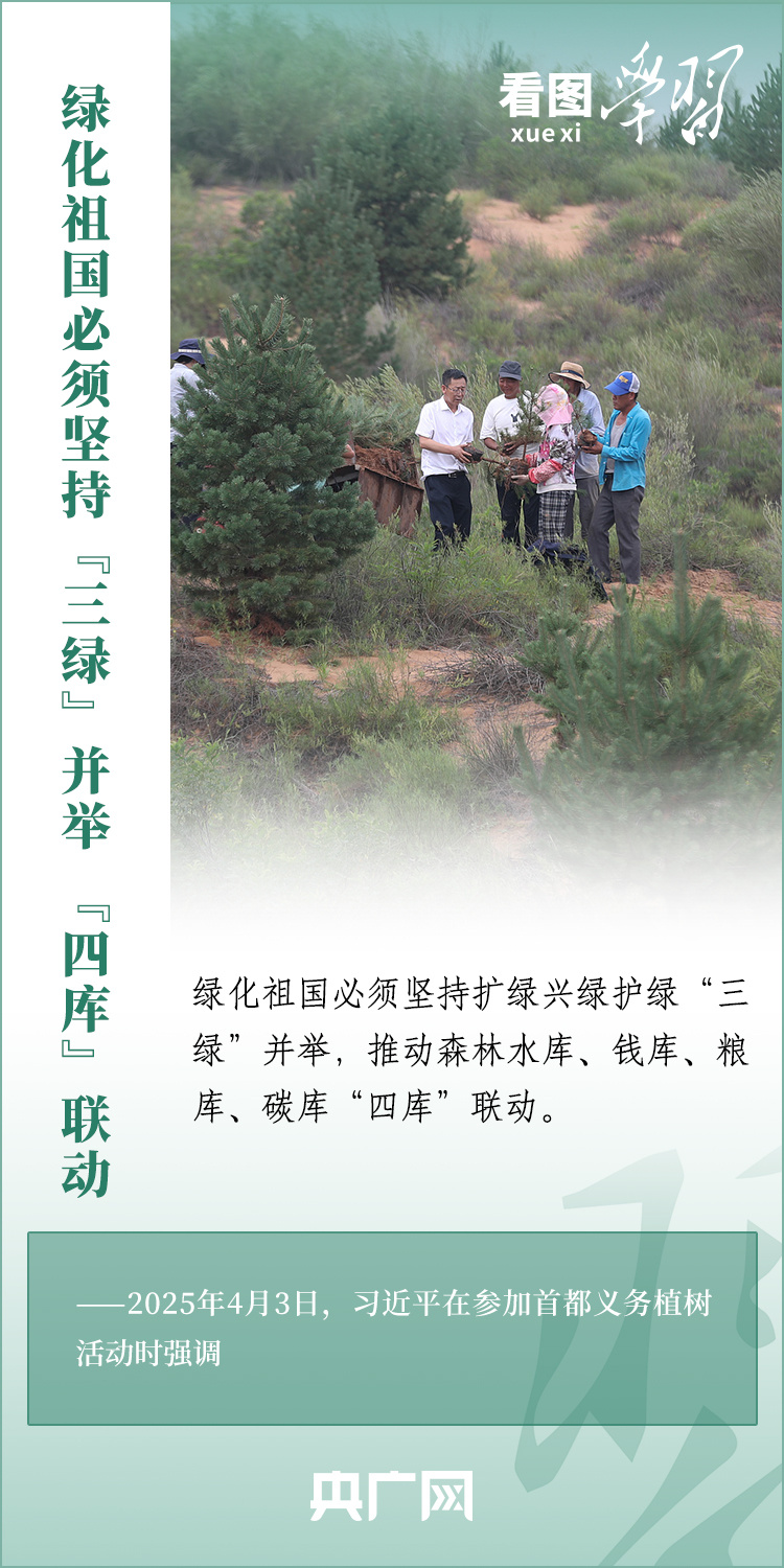 植樹造林是生態(tài)文明建設重要一環(huán)。4月3日,習近平總書記參加首都義務植樹活動。在植樹現(xiàn)場,總書記高度肯定國土綠化工作取得來之不易的成績,強調綠化祖國必須堅持“三綠”并舉、“四庫”聯(lián)動,要更加注重“提質”“興業(yè)”“利民”,“匯聚共建美麗中國的磅礴力量,讓祖國大地更加綠意盎然、生機勃發(fā)”。一起來學習!