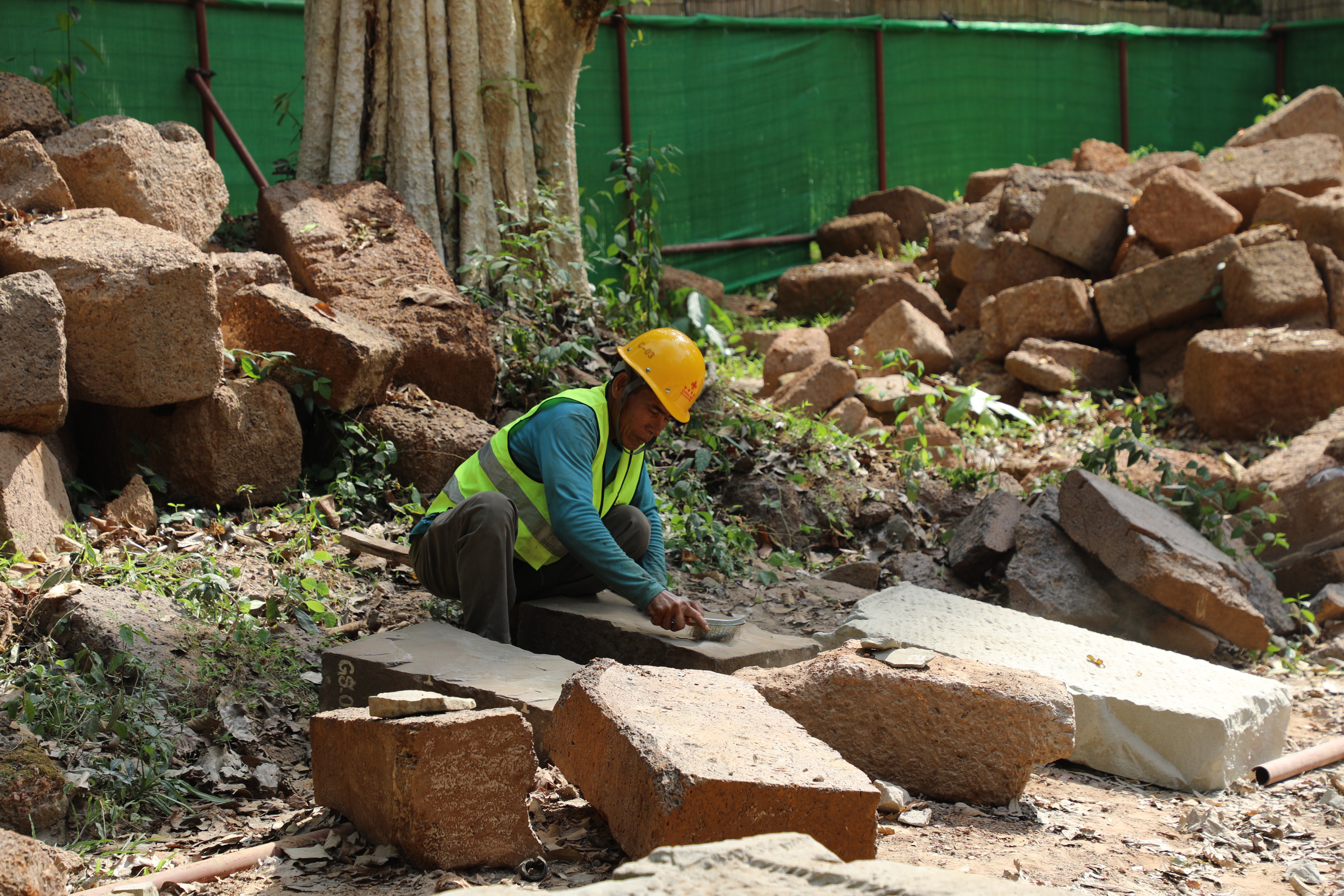 一名柬埔寨工人正在王宮遺址修復現(xiàn)場工作。(人民日報記者曹師韻 攝)