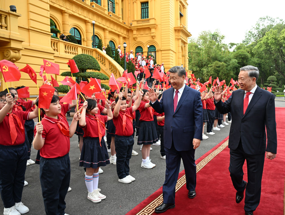 越共中央總書(shū)記蘇林為對(duì)越南進(jìn)行國(guó)事訪問(wèn)的中共中央總書(shū)記、國(guó)家主席習(xí)近平舉行隆重歡迎儀式,兩位領(lǐng)導(dǎo)人在紅毯上并肩前行。