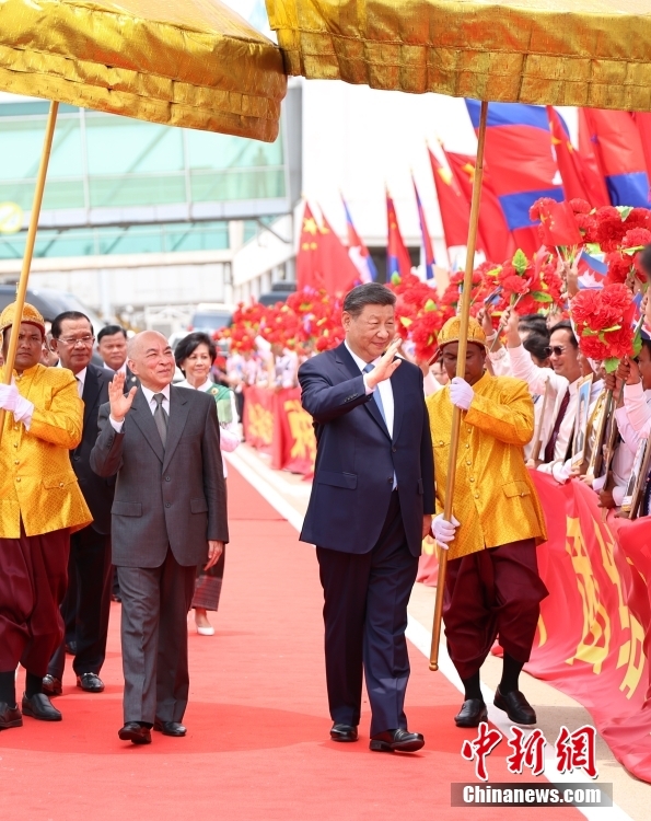 當(dāng)?shù)貢r(shí)間4月17日上午,中國國家主席習(xí)近平乘專機(jī)抵達(dá)金邊,應(yīng)柬埔寨國王西哈莫尼邀請,對柬埔寨進(jìn)行國事訪問。西哈莫尼在機(jī)場為習(xí)近平舉行隆重歡迎儀式。 中新社記者 盛佳鵬 攝