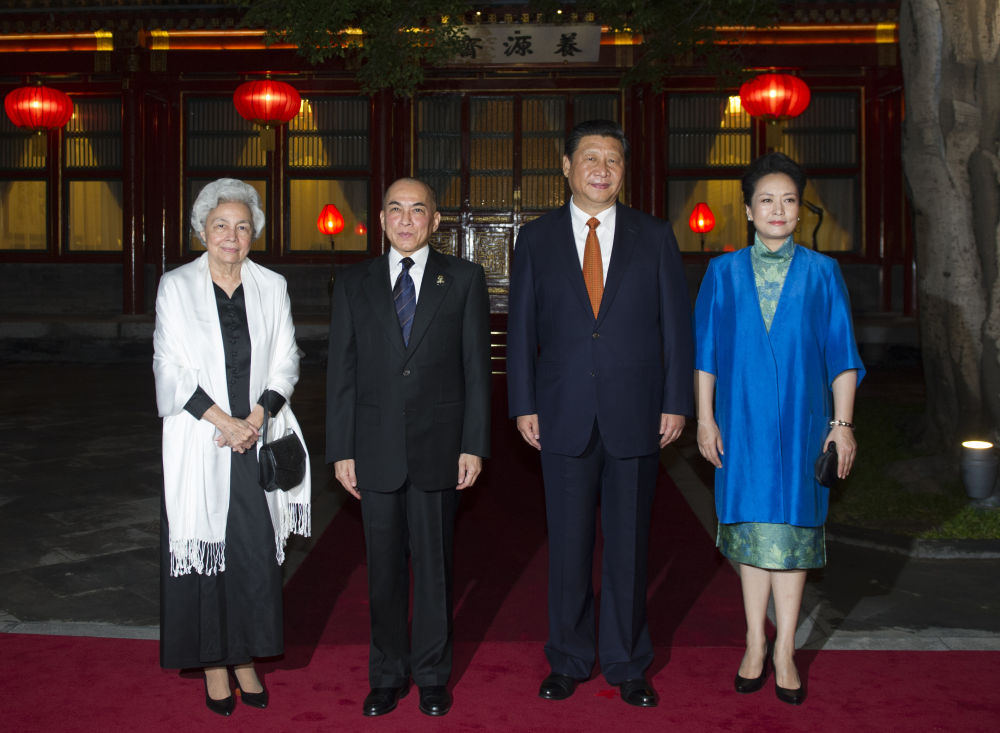 2014年9月25日晚,國(guó)家主席習(xí)近平在北京釣魚臺(tái)國(guó)賓館會(huì)見(jiàn)柬埔寨國(guó)王西哈莫尼和太后莫尼列。習(xí)近平主席夫人彭麗媛參加會(huì)見(jiàn)。