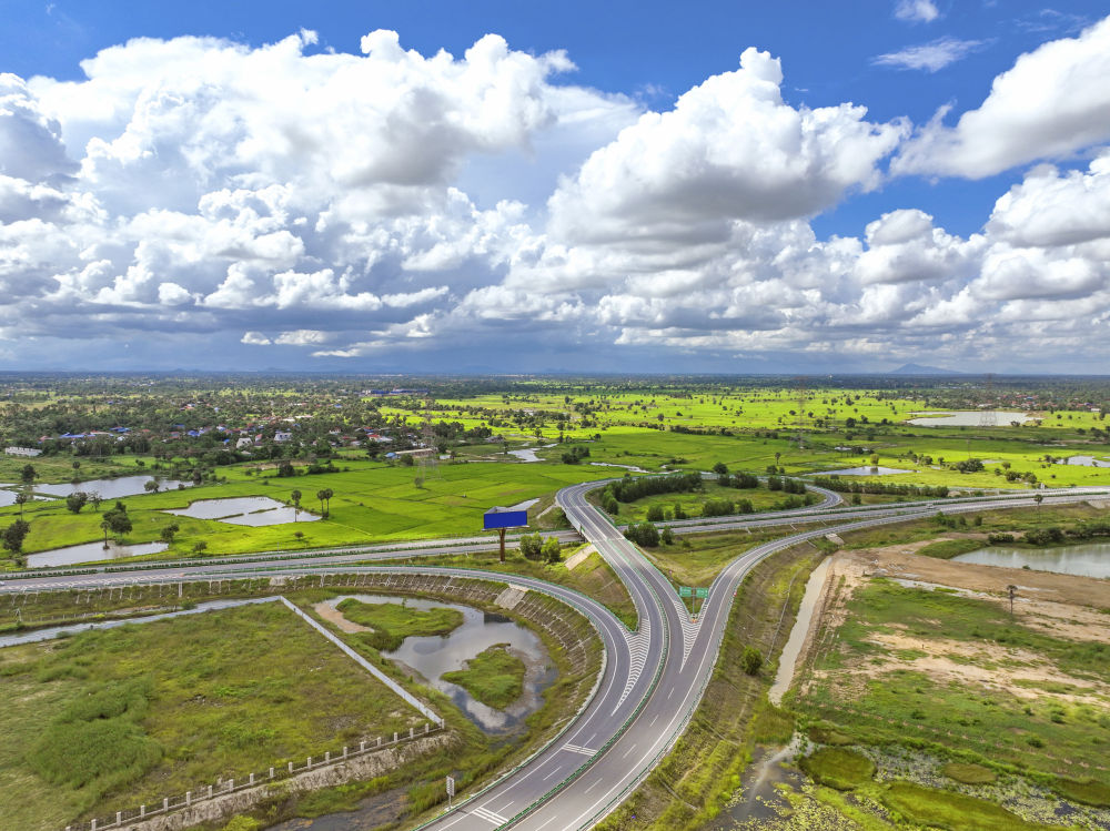 2024年9月25日在柬埔寨磅士卑省拍攝的金港高速公路(無(wú)人機(jī)照片)。連接柬埔寨首都金邊和最大深水海港西哈努克港的金港高速公路,是中柬共建“一帶一路”標(biāo)志性項(xiàng)目。