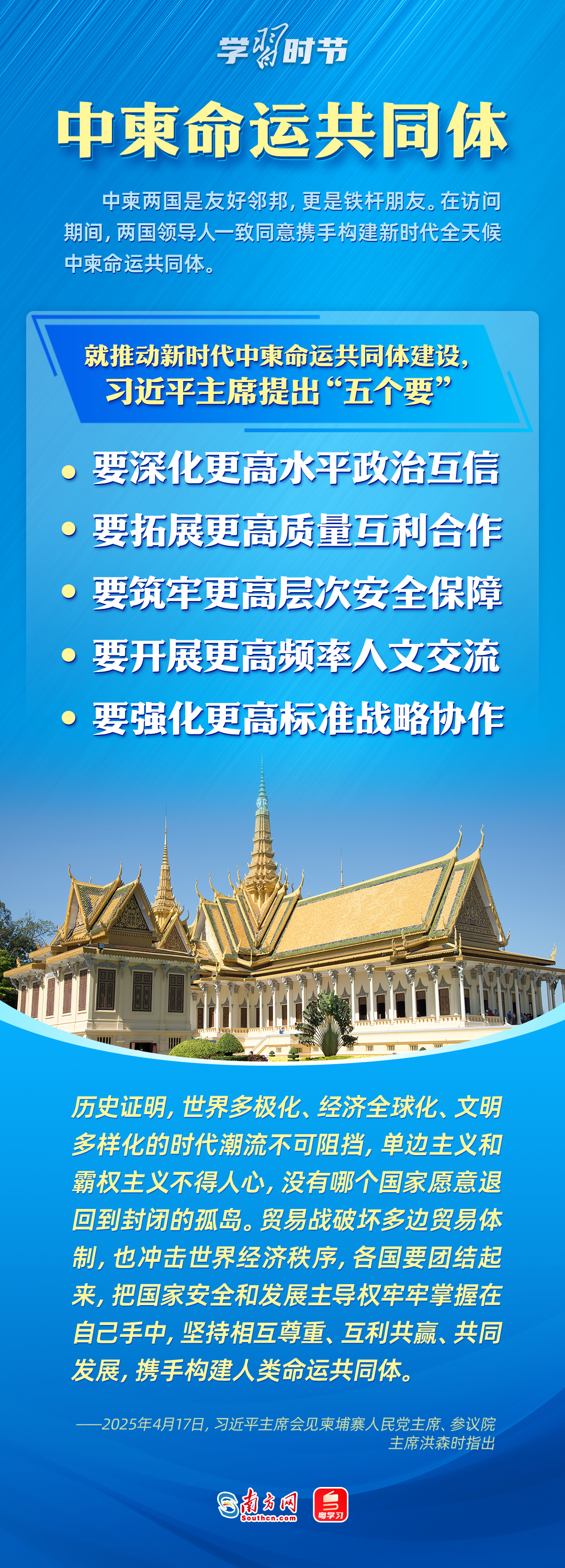 日前,中央周邊工作會議召開,強(qiáng)調(diào)要聚焦構(gòu)建周邊命運(yùn)共同體,努力開創(chuàng)周邊工作新局面。4月14日至18日,習(xí)近平主席出訪東南亞三國——越南、馬來西亞、柬埔寨。這是習(xí)近平主席今年首次出訪,對推動中國同三國關(guān)系發(fā)展具有重大意義,也為周邊命運(yùn)共同體建設(shè)擘畫了新藍(lán)圖。