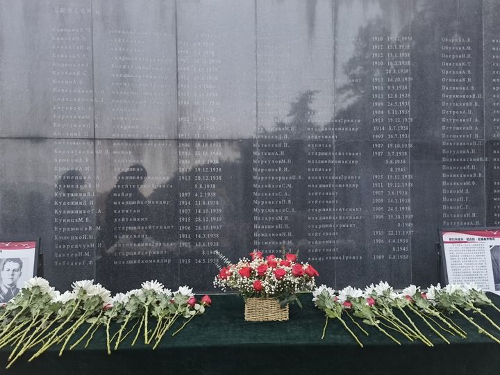 在南京抗日航空烈士紀(jì)念館鐫刻有蘇聯(lián)籍抗日航空英烈名錄的紀(jì)念碑前,擺放著人們獻(xiàn)上的鮮花(2024年11月22日攝)。新華社記者 邱冰清 攝