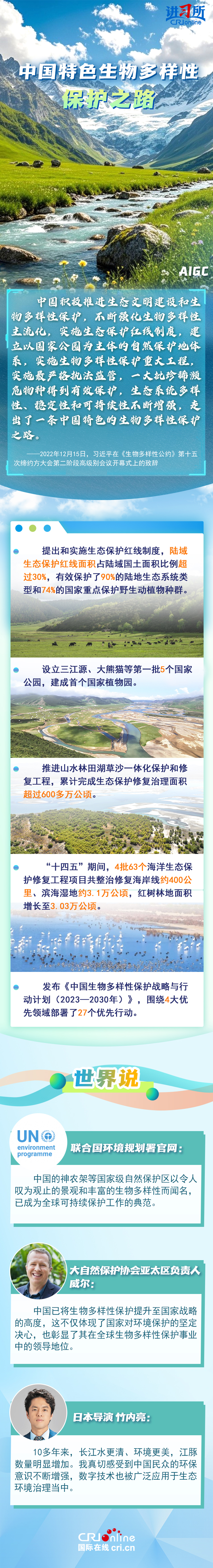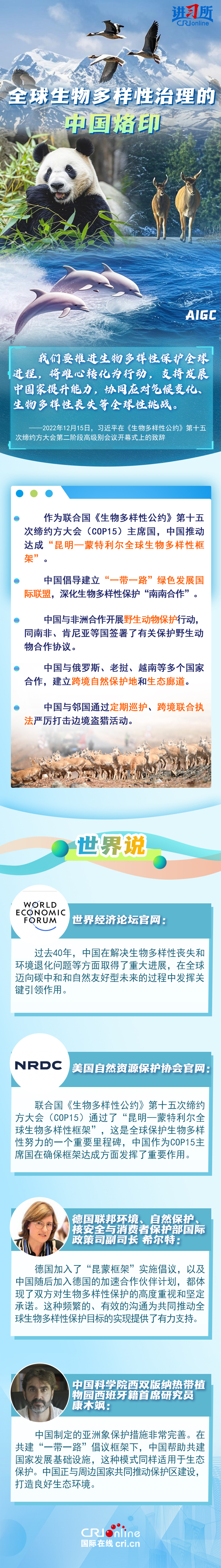 “心往一處想、勁往一處使,共建地球生命共同體?!弊鳛樽钤绾炇?、批準(zhǔn)《生物多樣性公約》的締約方之一,生物多樣性保護(hù)已經(jīng)上升為中國(guó)的國(guó)家發(fā)展戰(zhàn)略。國(guó)際人士表示,中國(guó)的一系列舉措體現(xiàn)出對(duì)生態(tài)環(huán)境保護(hù)的堅(jiān)定決心,同時(shí),中國(guó)依托共建“一帶一路”倡議等國(guó)際合作機(jī)制,為推動(dòng)全球生物多樣性保護(hù)提供了有力支持,在邁向自然友好型未來(lái)的過程中發(fā)揮關(guān)鍵的引領(lǐng)作用。