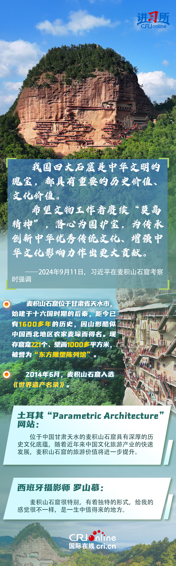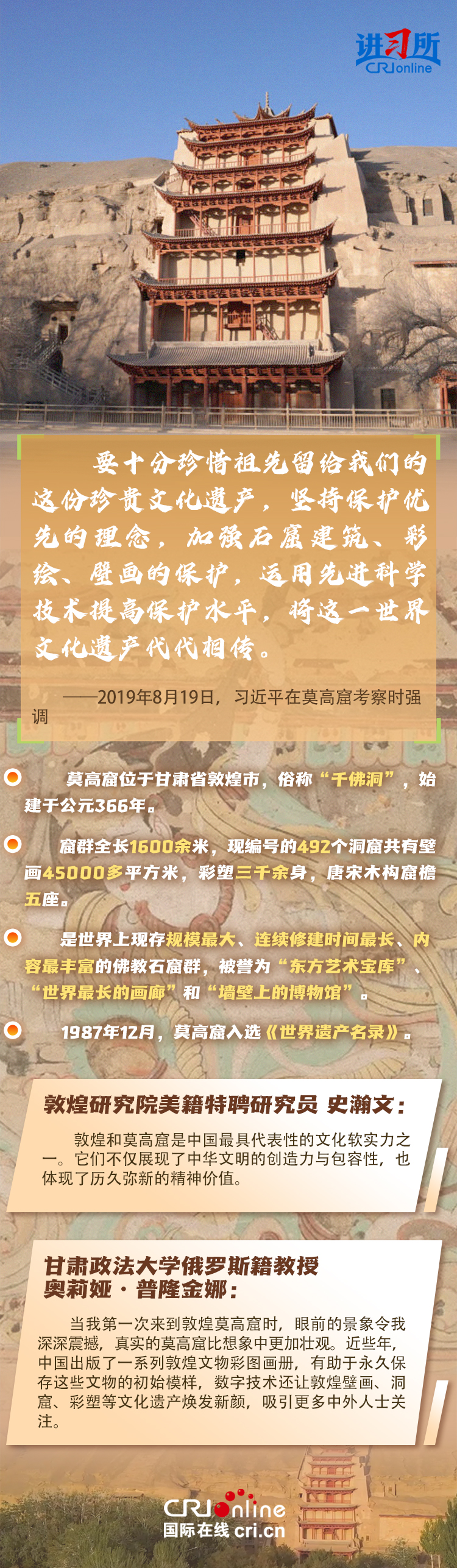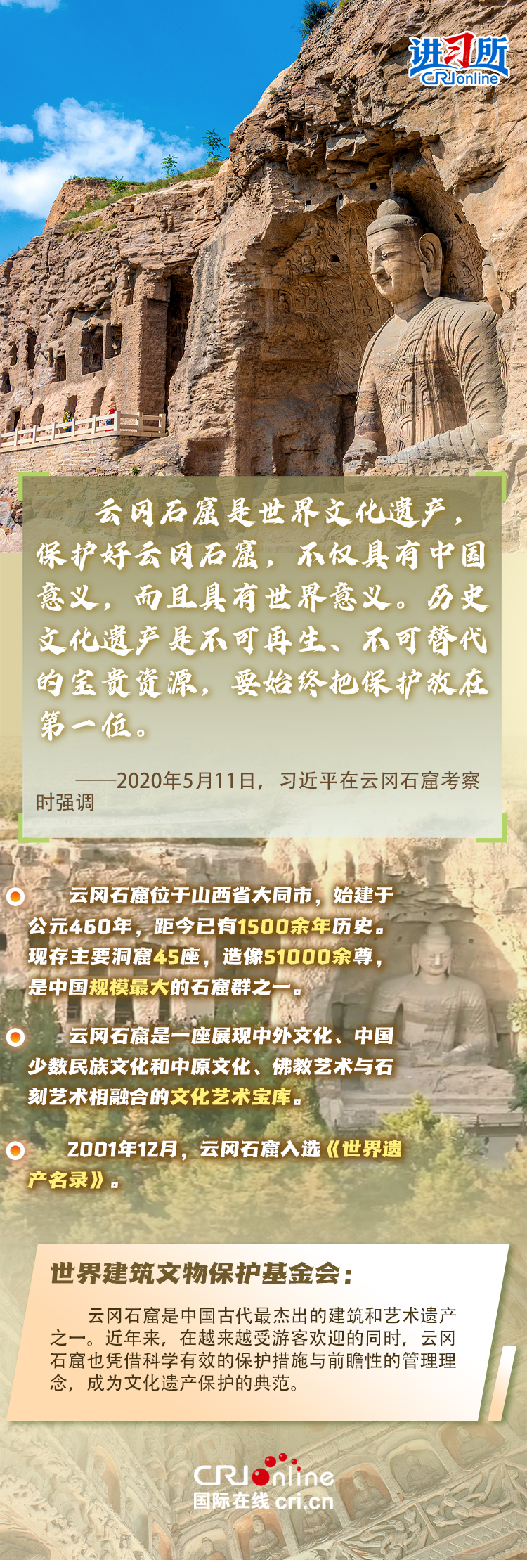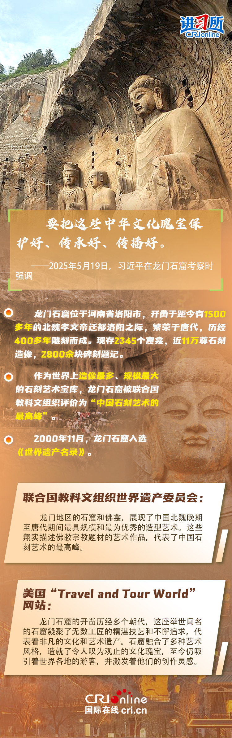龍門石窟被聯(lián)合國教科文組織評價為“中國石刻藝術的最高峰”,與敦煌莫高窟、云岡石窟、麥積山石窟并稱為“中國四大石窟”,具有重要歷史價值、文化價值。近年來,習近平先后考察了中國四大石窟。對這些承載著中華民族文化基因和血脈的文物和文化遺產(chǎn),習近平強調,“保護好、傳承好歷史文化遺產(chǎn)是對歷史負責、對人民負責?!?/p>