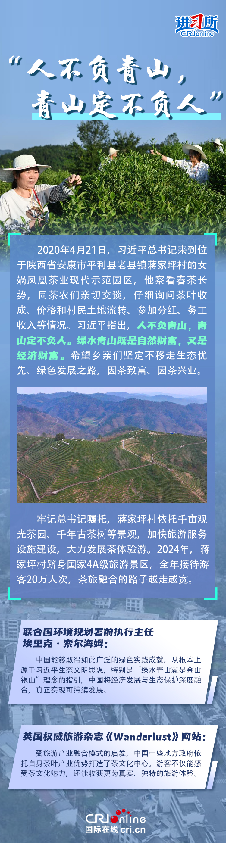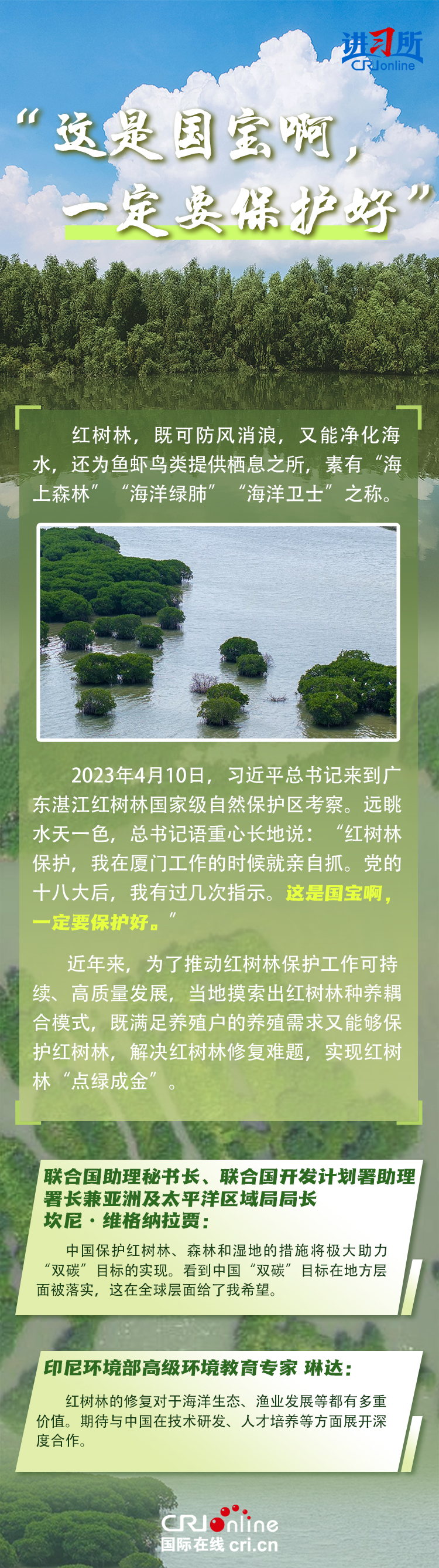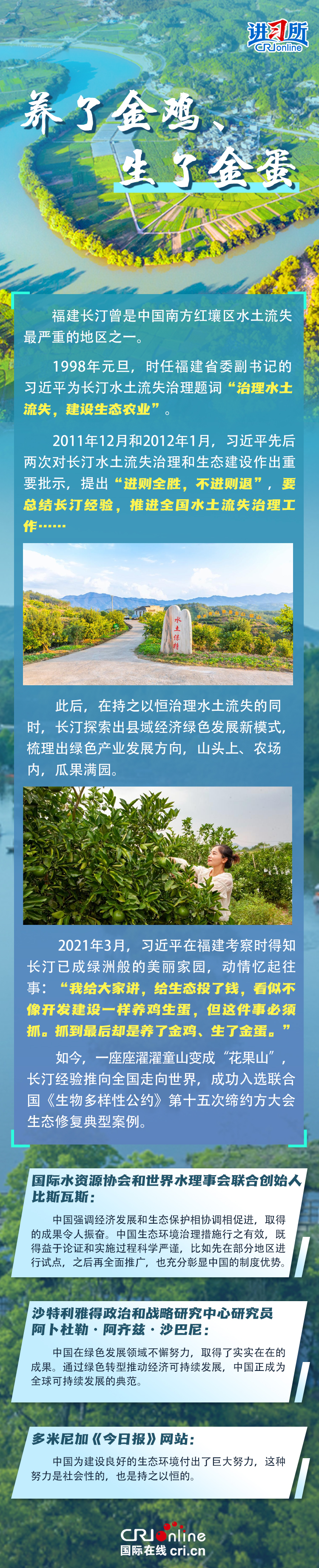 新時代以來,在習近平生態(tài)文明思想的科學指引下,“兩山”理念已深入人心,從“點綠成金”的紅樹林到一座座“花果山”,再到走向世界的長汀經驗……美麗中國建設邁出重大步伐,生態(tài)環(huán)境保護發(fā)生歷史性變化。國際社會認為,中國取得廣泛的綠色發(fā)展成就,從根本上源于習近平生態(tài)文明思想,特別是“兩山”理念的指引。在通過綠色轉型推動經濟可持續(xù)發(fā)展方面,中國正成為全球可持續(xù)發(fā)展的典范。