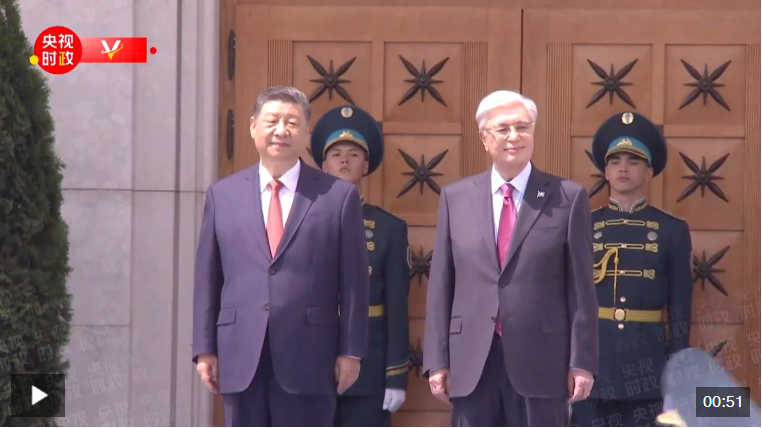習(xí)近平抵達(dá)阿斯塔納納扎爾巴耶夫國(guó)際機(jī)場(chǎng)時(shí),托卡耶夫總統(tǒng)率總統(tǒng)辦公廳主任達(dá)杰拜、副總理兼外長(zhǎng)努爾特列烏、總統(tǒng)外事顧問(wèn)卡濟(jì)漢、阿斯塔納市長(zhǎng)卡瑟姆別克等高級(jí)官員熱情迎接。身著盛裝的哈薩克斯坦女青年向習(xí)近平獻(xiàn)花。禮兵分列藍(lán)地毯兩側(cè)致敬,哈薩克斯坦少年兒童手持中哈兩國(guó)國(guó)旗熱烈歡迎習(xí)近平到訪。習(xí)近平在托卡耶夫陪同下觀看儀仗隊(duì)分列式,直升機(jī)懸掛中哈國(guó)旗從機(jī)場(chǎng)上空飛過(guò)。在機(jī)場(chǎng)貴賓樓內(nèi),兩國(guó)元首還共同欣賞哈薩克斯坦少年兒童的文藝表演。