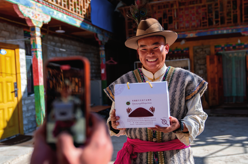 在西藏日喀則市定結縣陳塘鎮(zhèn),自媒體博主夏爾巴人旦增在拍攝視頻推介當地特產雞爪谷糌粑(2024年12月13日攝)丁增尼達攝/本刊