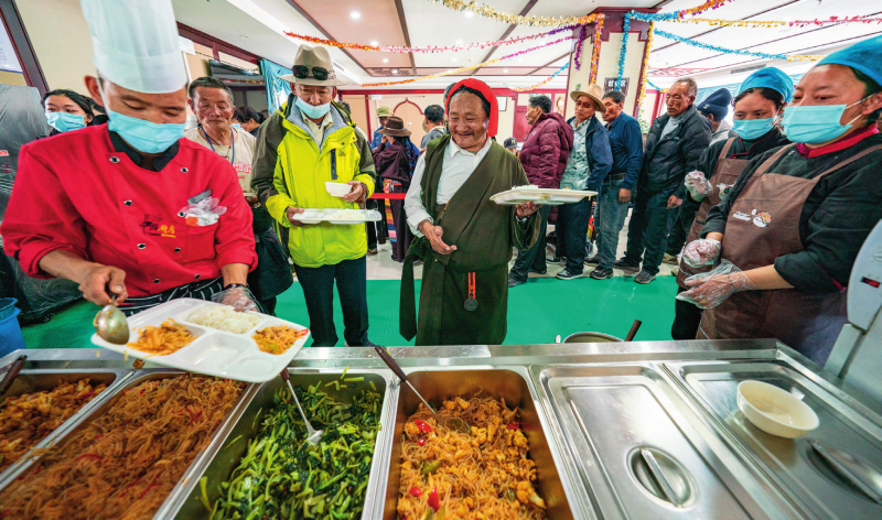 在西藏那曲市色尼區(qū)老年人日間照料中心,老人們在排隊打飯(2025年4月25日攝)丁增尼達攝/本刊