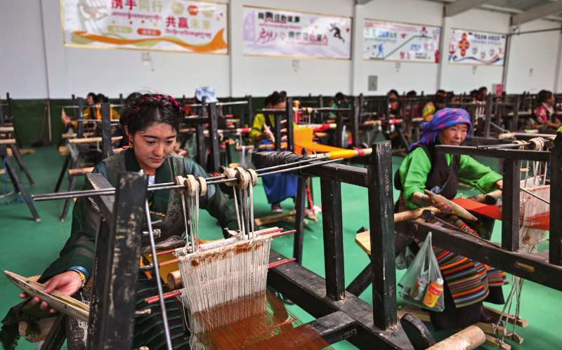 在西藏日喀則市仁布縣特色產業(yè)孵化園,亞德細褐羊毛織品農民專業(yè)合作社工作人員在車間里織布(2024年9月1日攝)孫瑞博攝/本刊