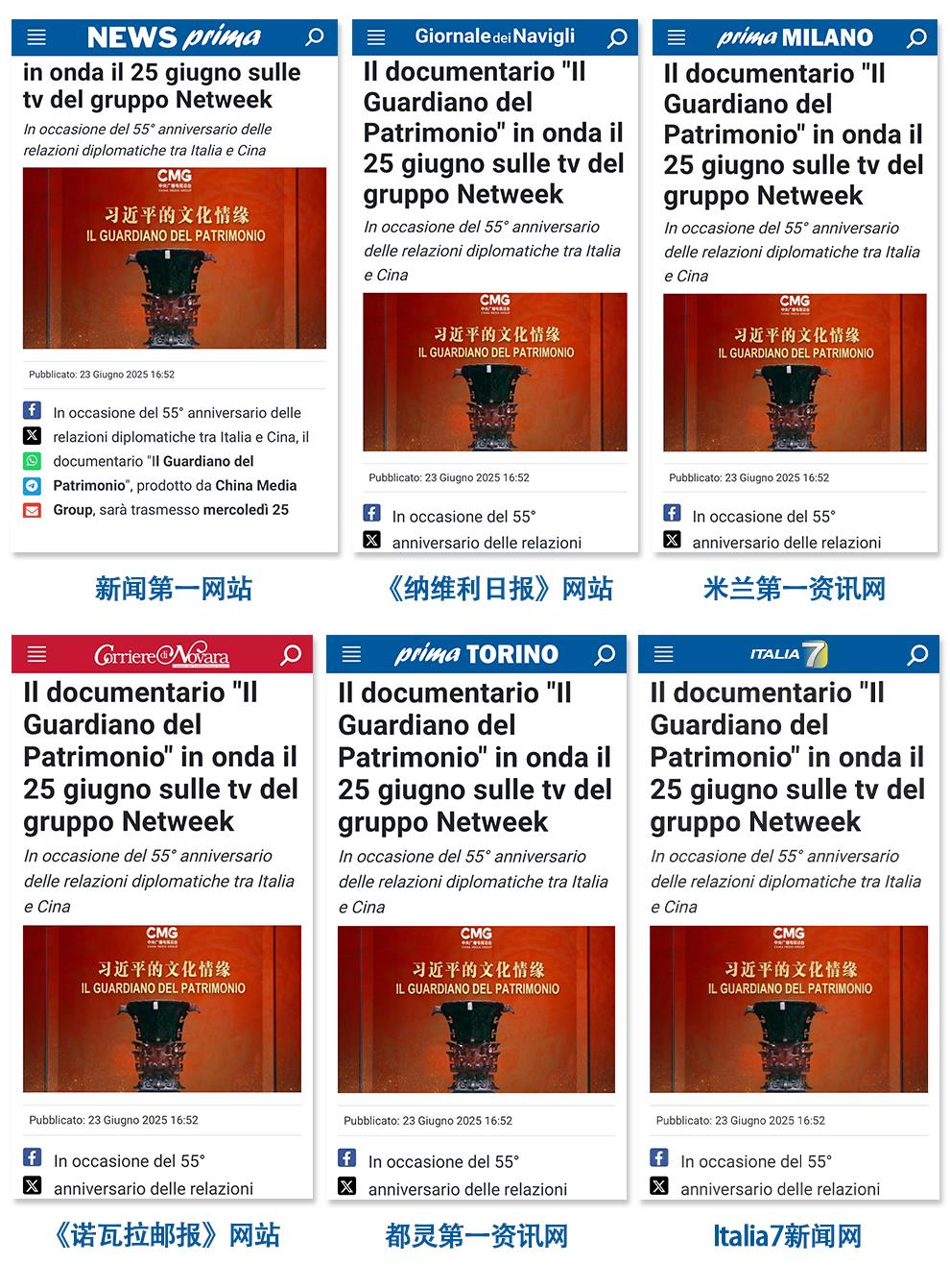 6月25日起,《習近平的文化情緣》在意大利阿爾瑪電視臺、多納電視臺、旅游電視臺、拉齊奧電視臺、倫巴第城市電視臺、羅馬科羅納廣播電視臺、米蘭帕維亞電視臺,《米蘭財經報》網站等30多家意主流媒體平臺陸續(xù)上線播出。