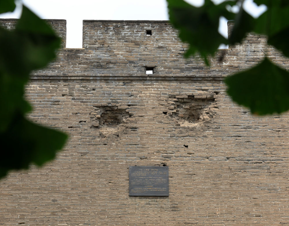 這是2025年7月4日拍攝的宛平城城墻上的彈坑遺跡。新華社記者 張晨霖 攝