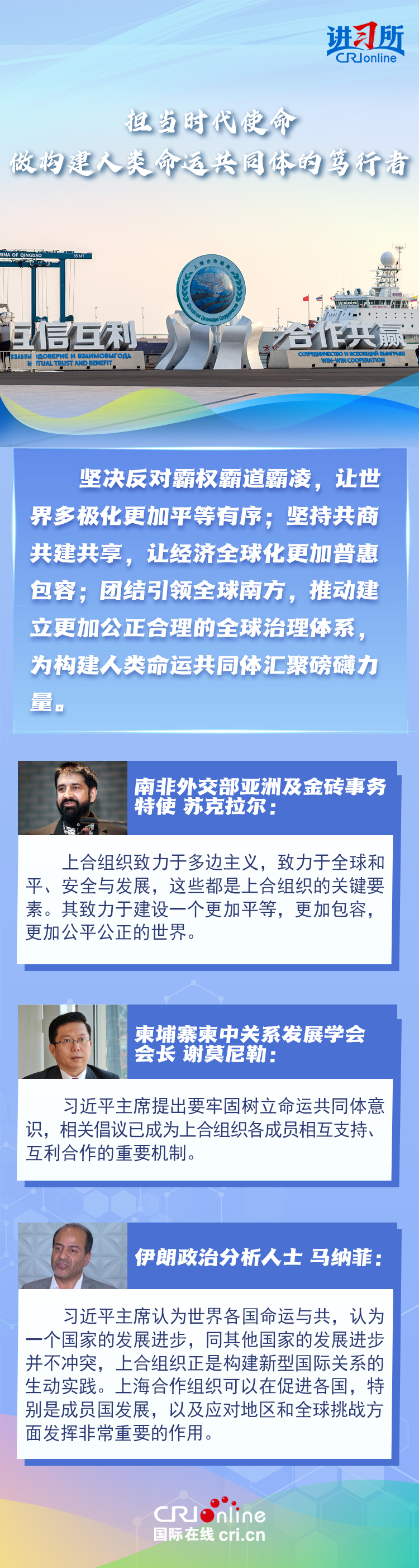 “讓‘上海精神’持續(xù)照亮構(gòu)建上海合作組織命運(yùn)共同體之路?!鄙虾:献鹘M織成立24年來(lái),始終秉持“上海精神”,成功走出了一條順應(yīng)時(shí)代潮流、契合各方需求的區(qū)域合作道路,樹立起新型國(guó)際關(guān)系的典范。在國(guó)際人士眼中,上海合作組織站在歷史正確一邊,致力于建設(shè)一個(gè)更加平等,更加包容,更加公平公正的世界,對(duì)維護(hù)地區(qū)和全球和平至關(guān)重要。