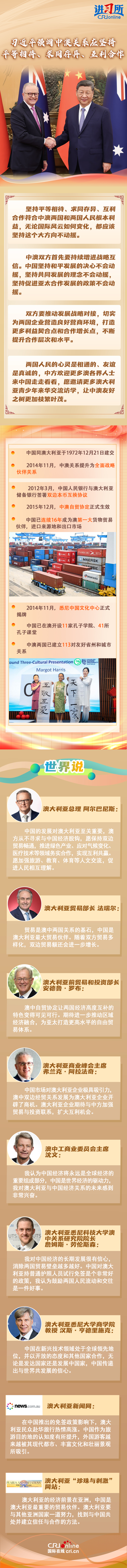 近年來,在雙方共同努力下,中澳關系走出低谷、實現(xiàn)轉圜,給兩國人民帶來了實實在在福祉。中澳全面戰(zhàn)略伙伴關系已經(jīng)開啟第二個10年,迎來又一個重要發(fā)展階段,澳方各界人士及媒體認為,中國的發(fā)展對澳大利亞至關重要,澳大利亞要與其他亞洲國家一道努力,找到與中國共處并建立信任與合作的方法。