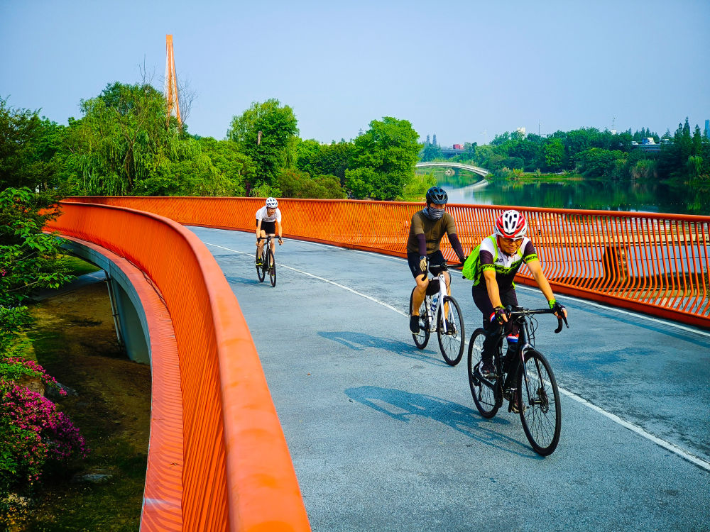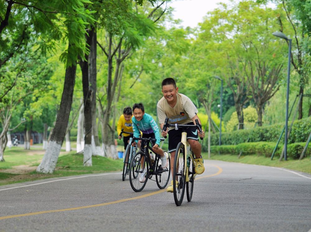 2023年6月25日,市民在四川成都錦城湖公園綠道上騎行。