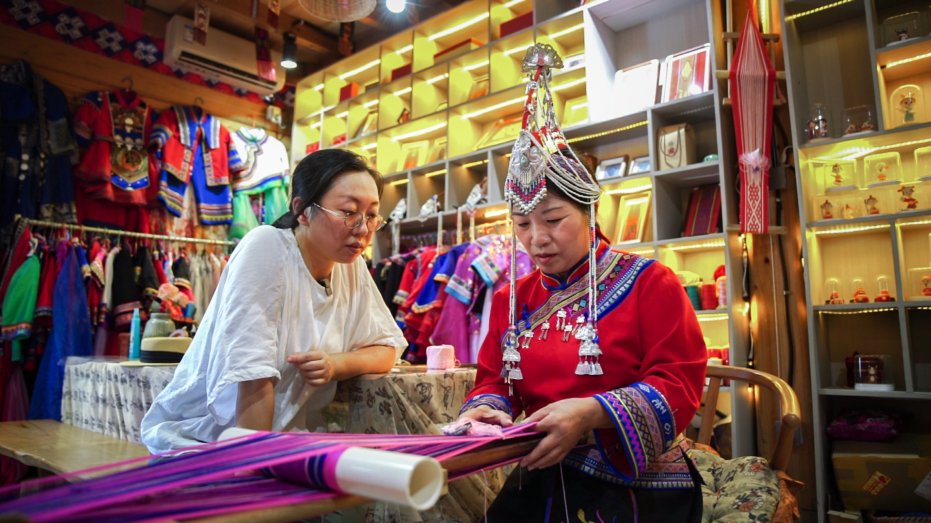 胡珊(左一)在庫(kù)村非遺工坊學(xué)做畬族彩帶(央廣網(wǎng)發(fā) 林港 攝)