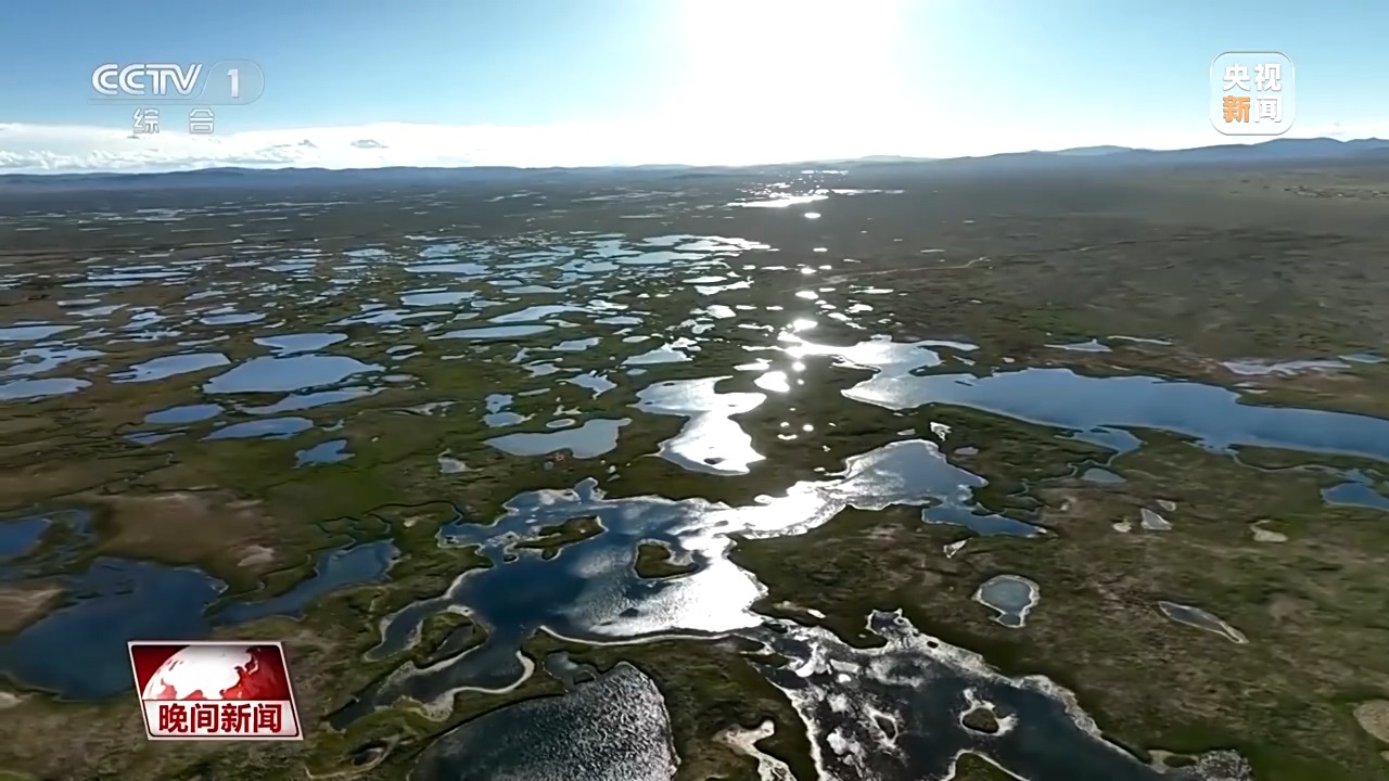 從高空俯瞰,無數(shù)湖泊沼澤,在陽光的照耀下,星星點點、光彩奪目,如同綻放的花朵,點綴在高原之上。
