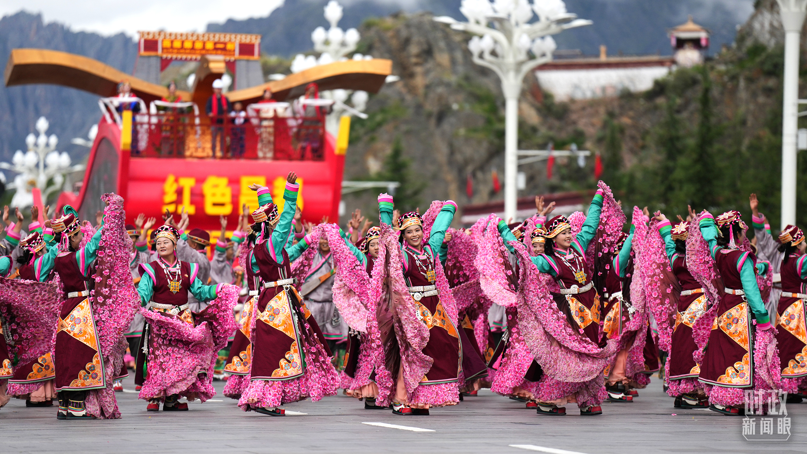 六十載櫛風沐雨,一甲子滄海桑田。格桑花海群舞中,悠揚的扎念琴聲響起,雄渾的甲諧舞、瓊結卓舞、弦子舞、鍋莊舞、普蘭宣舞應接不暇,舞出西藏繁榮發(fā)展的精氣神。身穿工布服飾、飛天服飾等藏族特有服飾的游行群眾,以一場非物質文化遺產的盛宴向西藏自治區(qū)成立60周年獻禮。