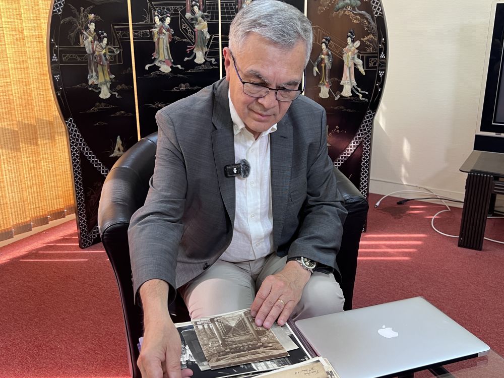 2025年6月23日,貝石濤在巴黎近郊接受記者采訪時翻看與貝熙業(yè)醫(yī)生相關(guān)的歷史資料。新華社記者 孫鑫晶 攝