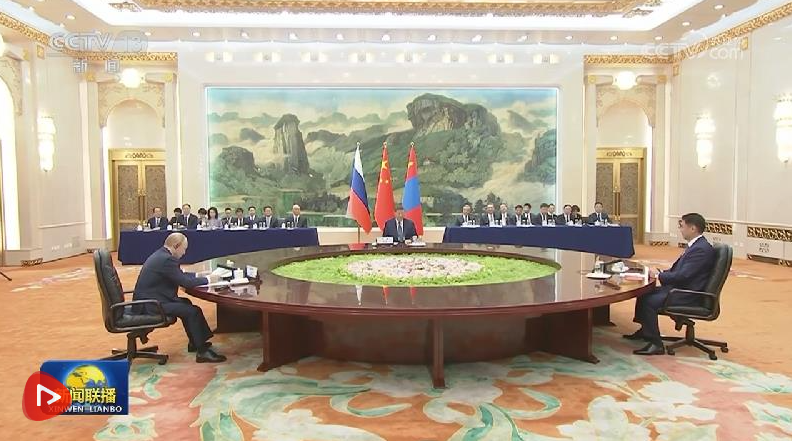 9月2日上午,國家主席習近平同俄羅斯總統(tǒng)普京、蒙古國總統(tǒng)呼日勒蘇赫在北京人民大會堂舉行中俄蒙三國元首第七次會晤。
