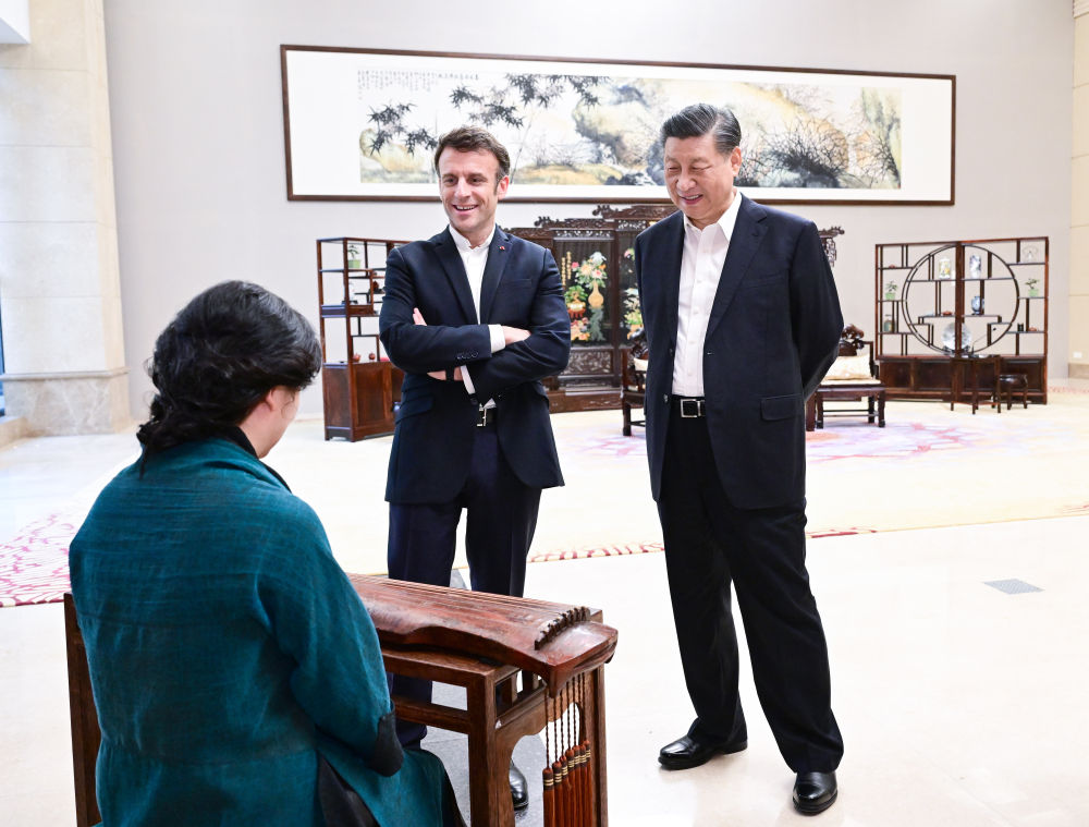 2023年4月7日,國家主席習(xí)近平在廣東省廣州市松園同法國總統(tǒng)馬克龍舉行非正式會(huì)晤。這是兩國元首在白云廳欣賞古琴演奏。新華社記者 岳月偉 攝
