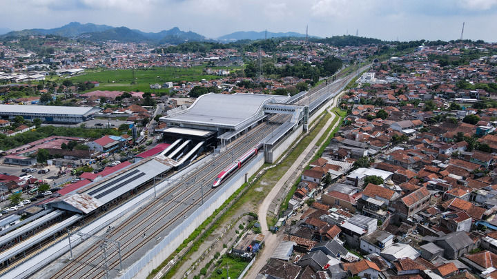 這是2025年5月20日在印度尼西亞帕達(dá)拉朗拍攝的雅萬高鐵列車(無人機照片)。新華社記者 徐欽 攝