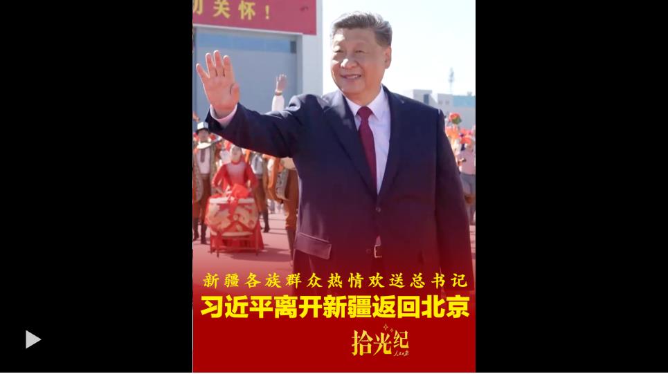 25日,習(xí)近平乘專機(jī)返回北京。烏魯木齊天山機(jī)場(chǎng)奏響別具特色的樂曲《我們?cè)谝黄稹?,各族群眾載歌載舞熱情歡送總書記。