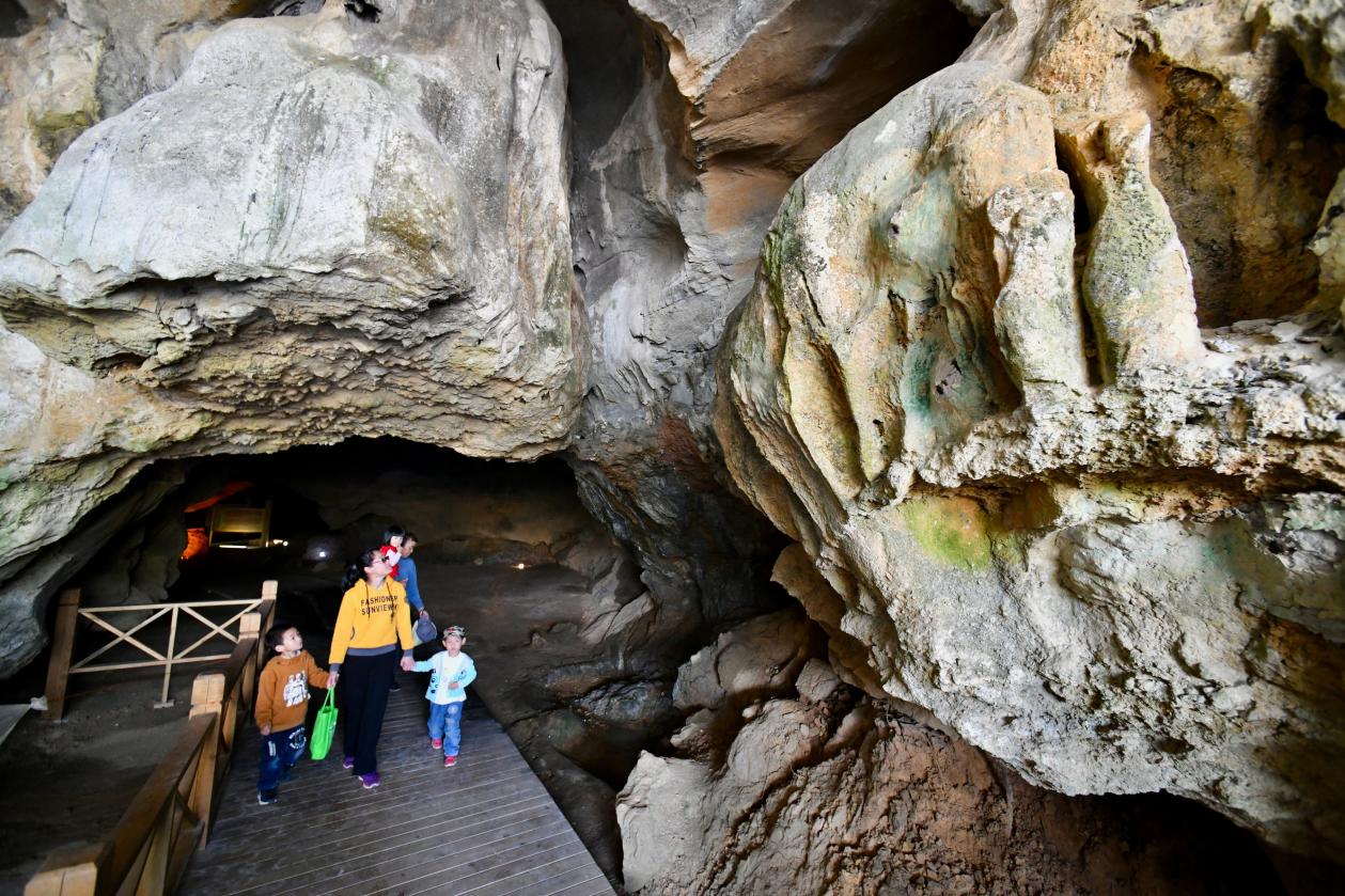 游客在萬壽巖遺址船帆洞內(nèi)游覽。