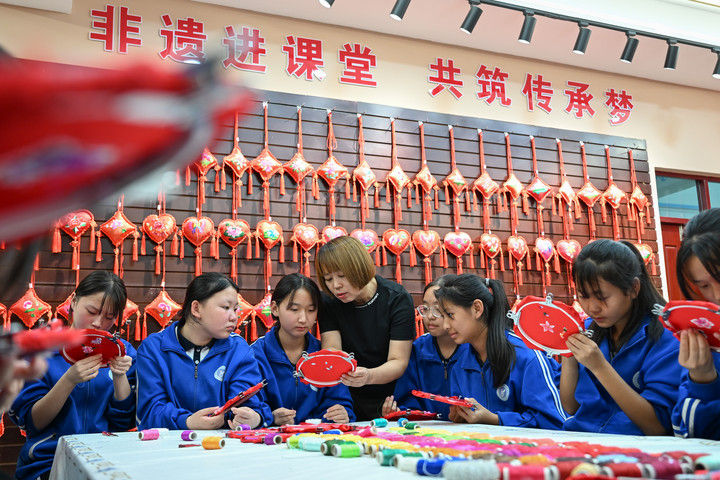 2025年9月26日,內(nèi)蒙古興安盟科右中旗巴彥呼舒第六中學美術教師、非遺代表性傳承人吳斯琴(左四)指導學生刺繡。近年來,內(nèi)蒙古興安盟科爾沁右翼中旗巴彥呼舒第六中學將當?shù)貒壹壏沁z圖什業(yè)圖刺繡引入校園,開設校本課程,并成立興趣社團,在豐富校園文化生活的同時,讓學生們近距離感受非遺的魅力,弘揚和傳承中華優(yōu)秀傳統(tǒng)文化。隨著國產(chǎn)動畫電影《哪吒之魔童鬧?!凡粩嗨⑿轮袊笆菲狈考o錄,參與電影配樂的貴州省榕江縣三寶侗寨的楊想妮和“舞樂蟬歌”團隊為更多人所熟知。樂團成員懷揣“用音樂傳遞侗族文化,讓世界聽見侗族大歌”的共同夢想,將侗族大歌推向更廣闊的舞臺。這是2025年4月22日,楊想妮在貴州省黎平縣肇興鎮(zhèn)廈格侗寨教前來研學的孩子們唱侗歌。