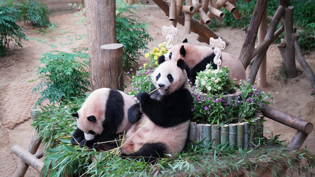2025年7月7日,在韓國京畿道龍仁市愛寶樂園,大熊貓媽媽“愛寶”(中)和“睿寶”、“輝寶”在慶生活動上享用美食。新華社發(fā)(孫一然攝)