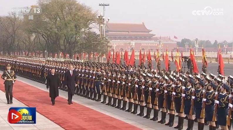 費(fèi)利佩六世抵達(dá)時(shí),禮兵列隊(duì)致敬。習(xí)近平同費(fèi)利佩六世登上檢閱臺(tái),軍樂團(tuán)奏中西兩國國歌,天安門廣場鳴放禮炮21響。費(fèi)利佩六世在習(xí)近平陪同下檢閱中國人民解放軍儀仗隊(duì),并觀看分列式。