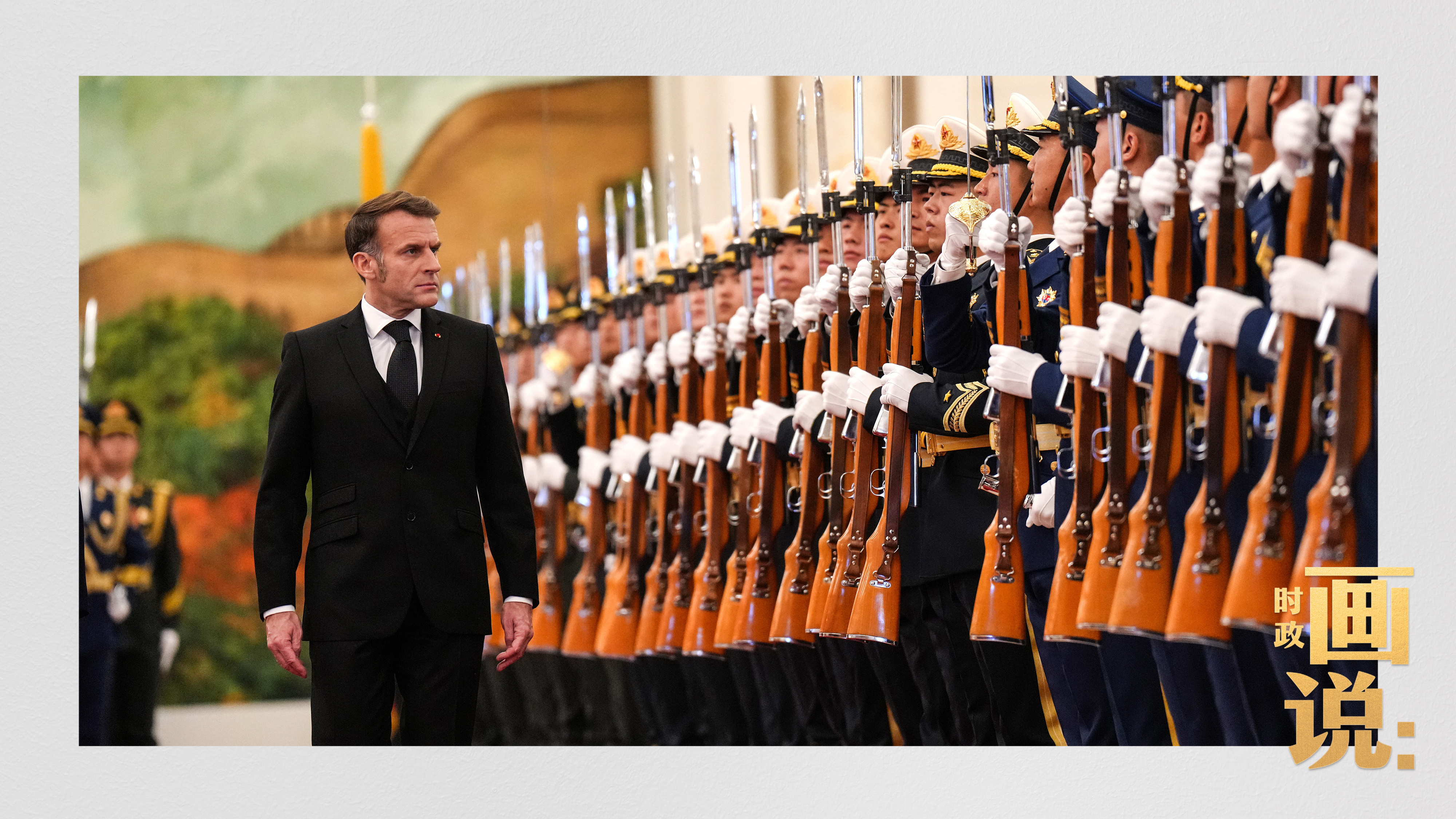 △馬克龍在習近平陪同下檢閱中國人民解放軍儀仗隊并觀看分列式