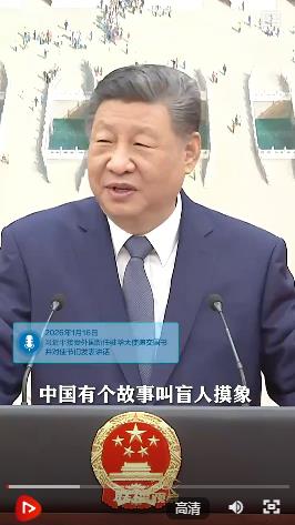 儀式結(jié)束后,習(xí)主席在對使節(jié)們發(fā)表講話時,講到一則“盲人摸象”的寓言故事。習(xí)主席說:“象很大,如果是一個盲人,他摸到一條腿,就說象是一個柱子,摸到肚子,就說象是一堵墻,但實際上不是完整的象。”
