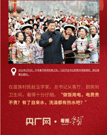 2020年底,貴州最后9個深度貧困縣退出貧困縣序列。次年2月,總書記就專程來到曾經(jīng)的深度貧困村——貴州省畢節(jié)市化屋村。在苗族村民趙玉學家里,總書記看得仔細、問得真切,“做飯用電,電費貴不貴?有了自來水,洗澡都有熱水吧?”一句句家常話,嘮的是具體事,暖的是百姓心。