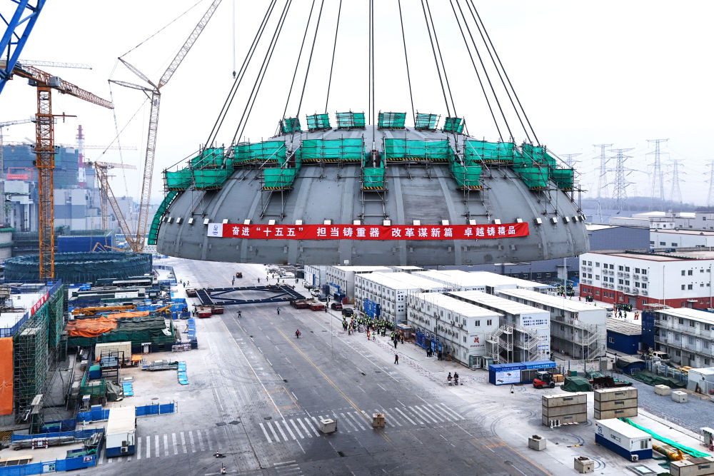 2026年2月10日在遼寧省葫蘆島市拍攝的徐大堡核電站1號機組核島鋼制安全殼頂封頭吊裝作業(yè)現(xiàn)場(無人機照片)。新華社發(fā)