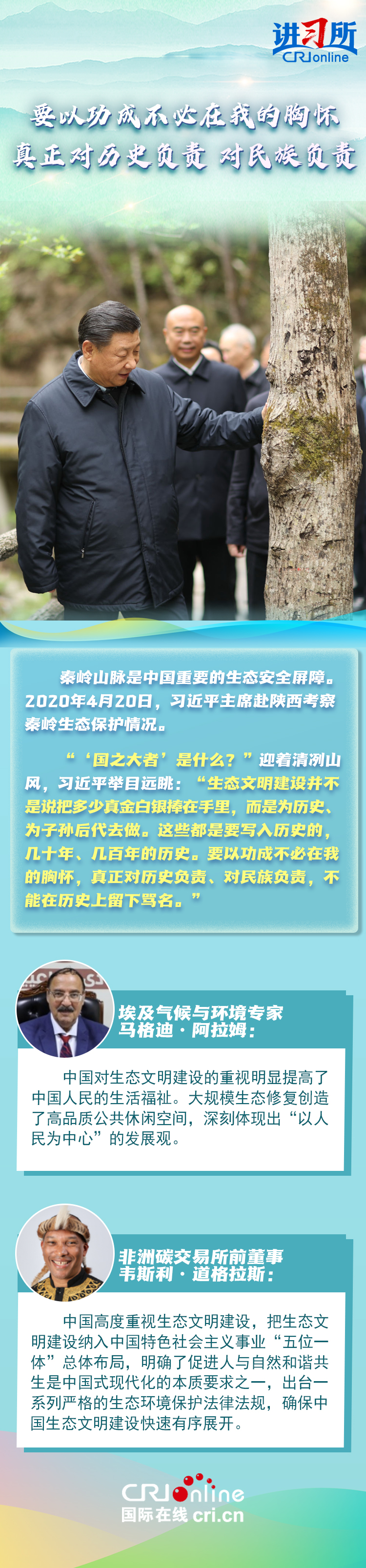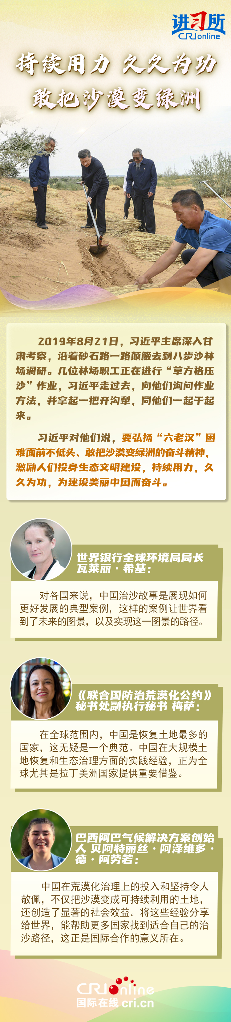 中共十八大以來,中國森林面積和蓄積量持續(xù)“雙增長”,荒漠化和沙化土地面積持續(xù)“雙縮減”,是全球增綠最多最快的國家。習(xí)近平主席始終身體力行:在北京連續(xù)14年參加首都義務(wù)植樹活動(dòng),在甘肅與林場職工一起進(jìn)行“草方格壓沙”作業(yè),在陜西親自“驗(yàn)收”秦嶺生態(tài)保護(hù)……